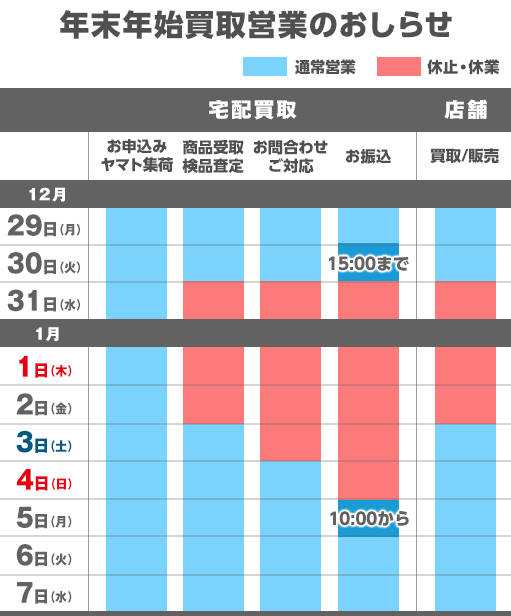 店舗・宅配買取ともに12月31日(水)~1月2日(金)まで休業いたします。
