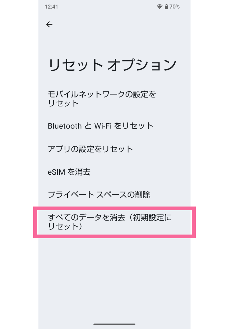 なお、お使いのスマホで使用しているSIMカードが「eSIM」の場合は、eSIMの設定を削除してから初期化する流れとなります。