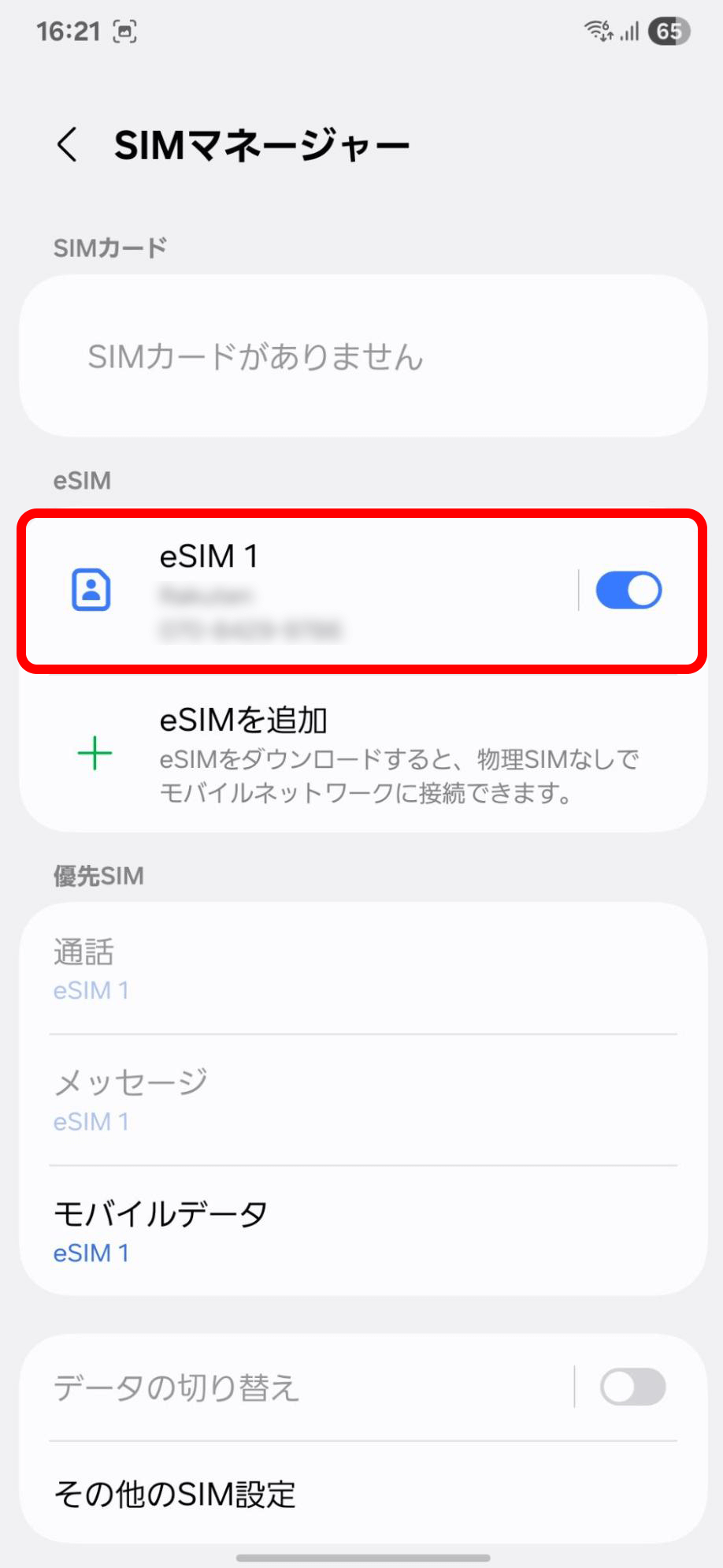 設定しているeSIMをタップ(画像だとeSIM 1)