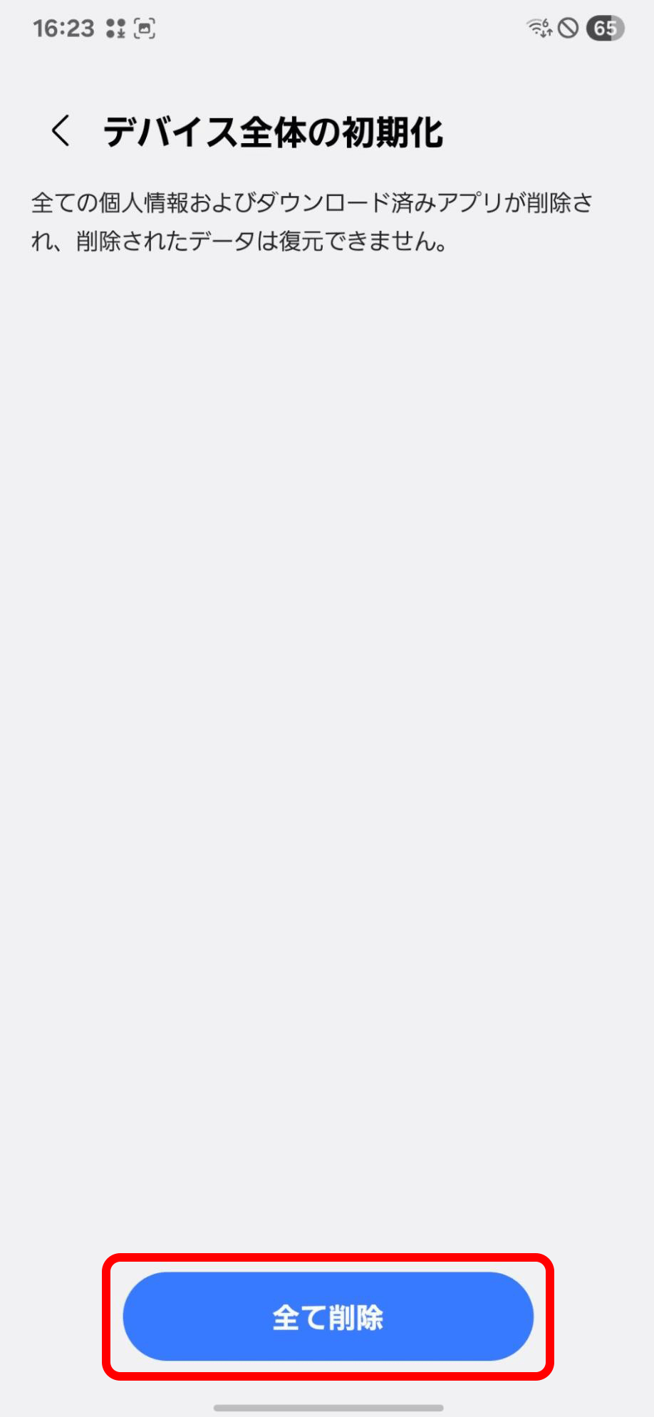 本体パスワードを入力すると、この画面に切り替わるので「全て削除」をタップ