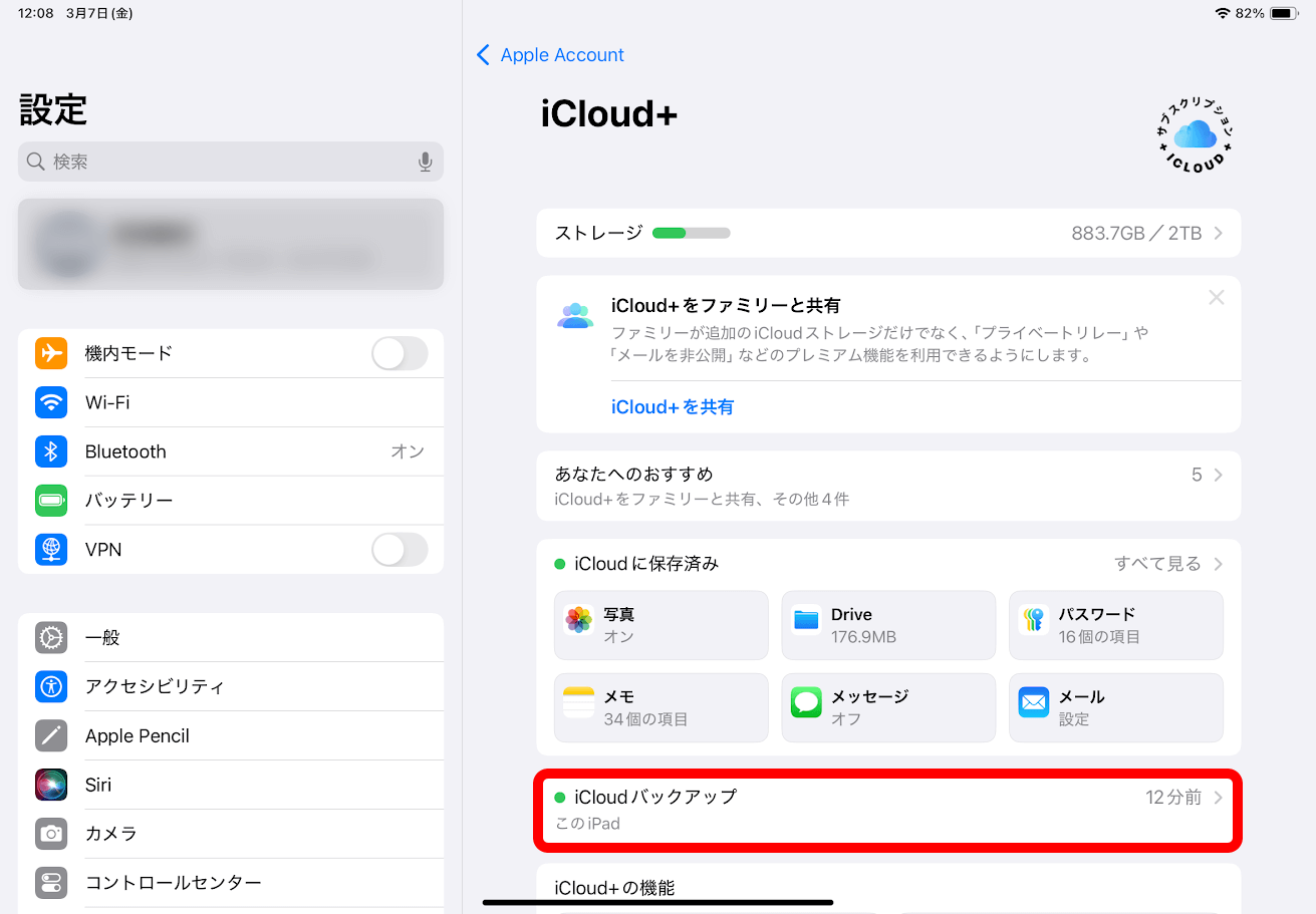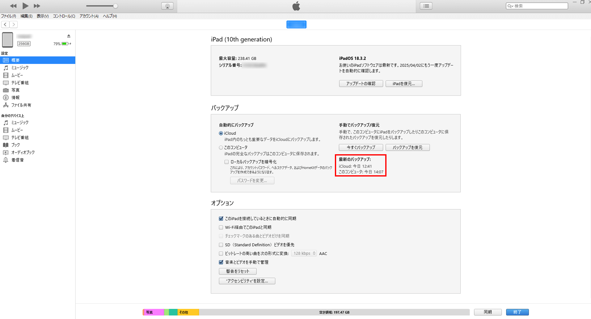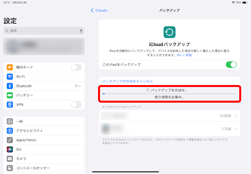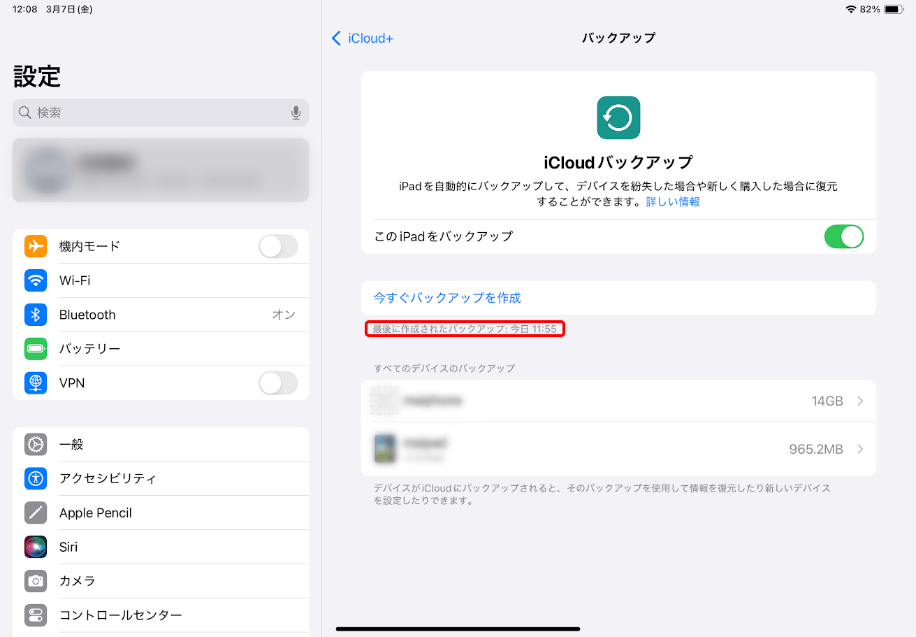 「最新のバックアップ」に現在の日時が表示されていれば、バックアップ完了です。