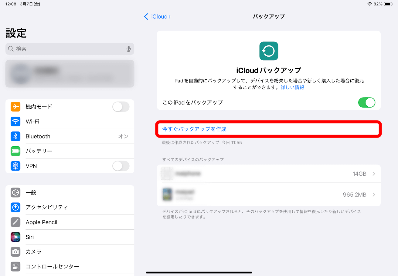 「最後に作成されたバックアップ」に現在の日時が表示されていれば、バックアップ完了です。