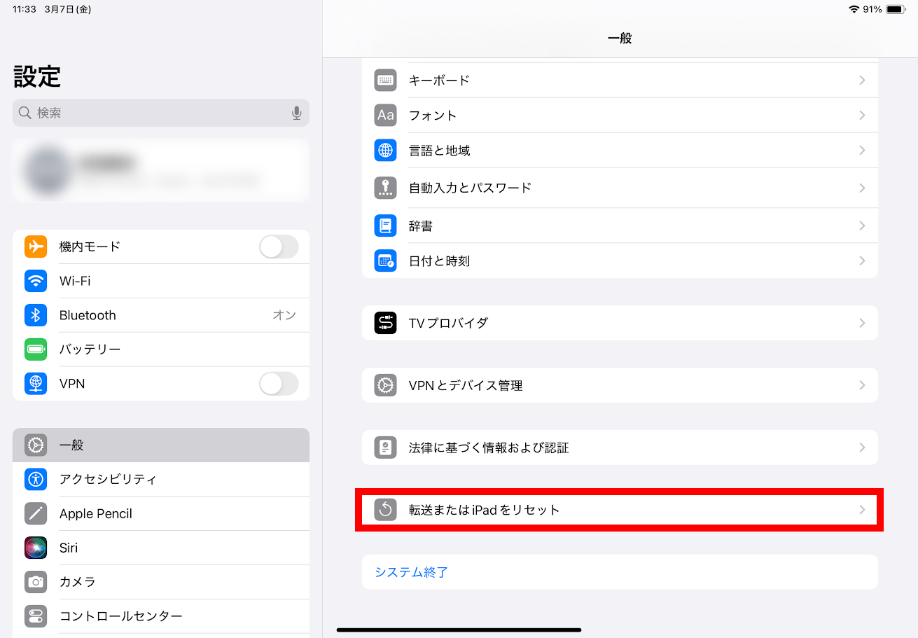 一般のメニューをスクロールして、「転送またはiPadをリセット」をタップします。