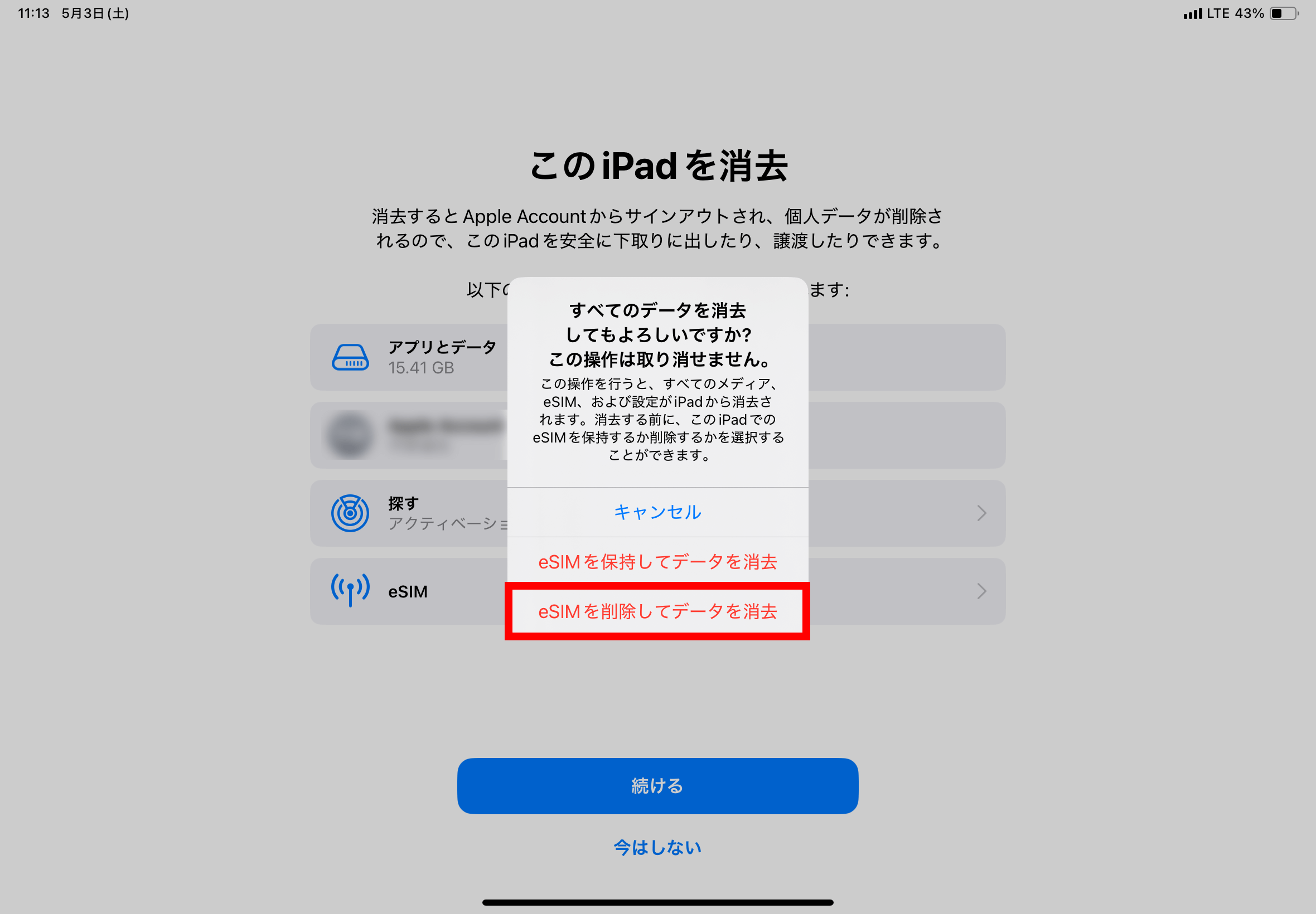 eSIMをすべて削除してデータを消去をタップします。(※eSIM対応のiPadのみ)