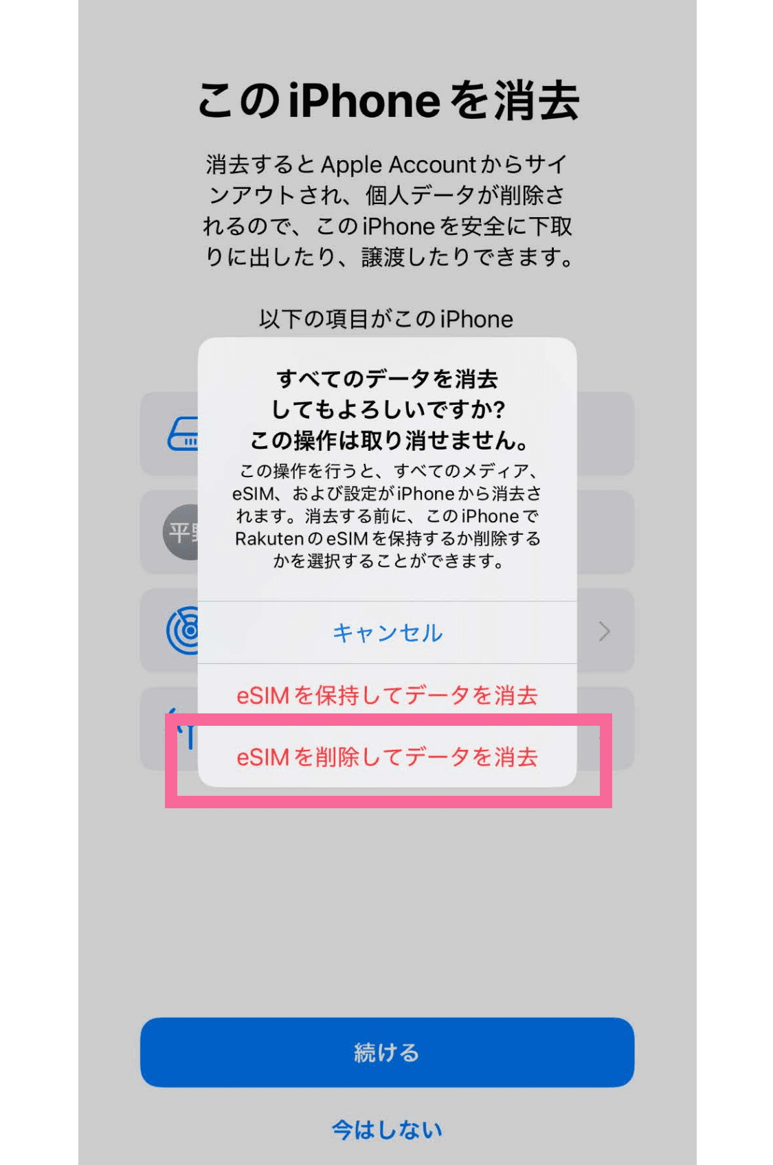 【eSIMを削除してデータを消去】をタップし、最後まで初期化を行えば完了です。