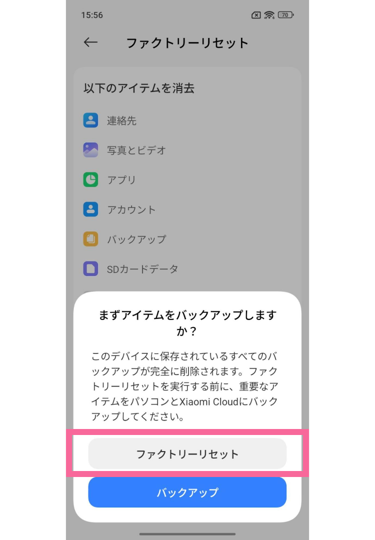 本体パスワードを入力すると、「まずアイテムをバックアップしますか?」のポップアップが表示されるので、「ファクトリーリセット」をタップ